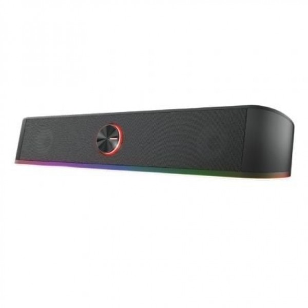 Barra de sonido estéreo con iluminación RGB y un diseño que ahorra espacio.