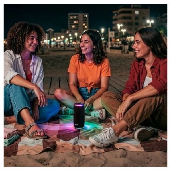 La luz LED multicolor integrada reacciona al ritmo y la intensidad de la música, creando una atmósfera dinámica, vibrante e inmersiva. Perfecta para animar las cenas o relajarse con un baño, tu música favorita y un poco de cromoterapia.