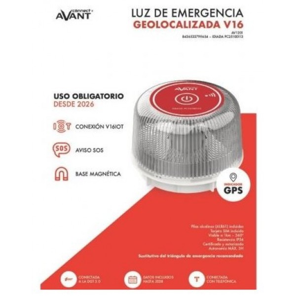 La luz de emergencia Avant V16 (AV1201) es una solución de seguridad vial moderna y obligatoria (a partir de 2026) que reemplaza al triángulo de emergencia. Cumple con los requisitos de la DGT, integrando geolocalización, indicador GPS, conectividad y una base magnética para facilitar su uso en carretera.