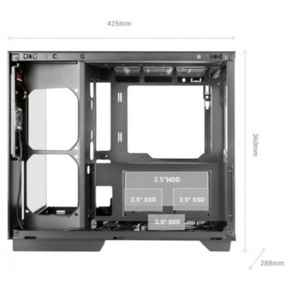 Su estructura de doble cámara optimizada separa la fuente de alimentación y el almacenamiento del resto de componentes. Esta organización mejora el flujo de aire, facilita el montaje y mantiene los cables ocultos, garantizando una estética impecable y un rendimiento térmico superior.