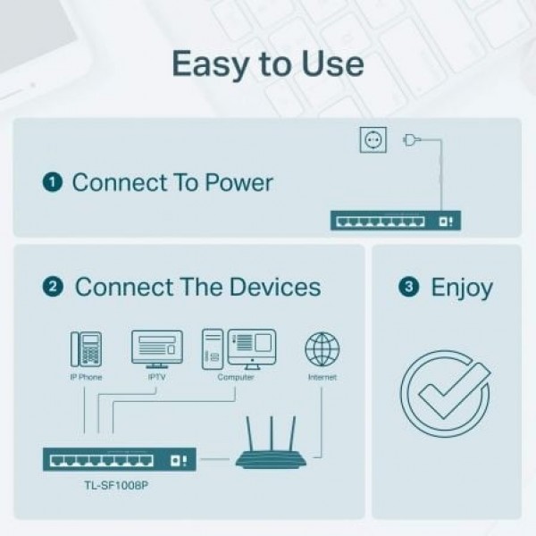 El TL-SF1008P es fácil de instalar y utilizar No requiere ningún tipo de configuración o instalación. El switch PoE de sobremesa con 8 puertos 10/100 Mbps TL-SF1008P de TP-LINK ofrece un rendimiento y calidad excepcionales por lo que resulta una excelente opción para ampliar tanto su red doméstica como la de su oficina.