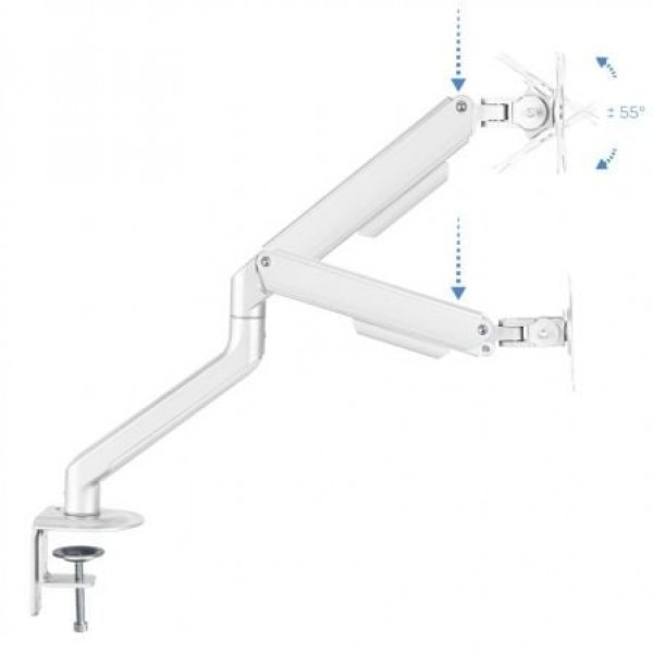 Agrega flexibilidad y ergonomía a tu lugar de trabajo.. Mueve sin esfuerzo el soporte con el mecanismo asistido por muelles. Adapta el monitor a la postura más cómoda que necesites para conservar una buena higiene postural. Disponible en dos colores: gris espacial y blanco. . . Especificaciones:. . Pantallas soportadas: 17""-32"". Compatible con VESA: 75x75 y 100x100. Peso máximo soportado de pantalla: 2-9 kg. Brazo regulable con mecanismo asistido por muelles. ángulo de inclinación: +55º/-55º. ángulo de giro: +90º/-90º. ángulo de rotación: +180º/-180º. Altura ajustable hasta 428 mm. Extensión máxima del brazo: 516 mm. Instalación mediante abrazadera o tornillo pasante. Sistema de organización de cables. Compatible con pantallas curvas. Color: Blanco. Peso neto: 2,2 kg. Peso bruto: 2,74 kg. Medidas del embalaje: 435x155x95 mm