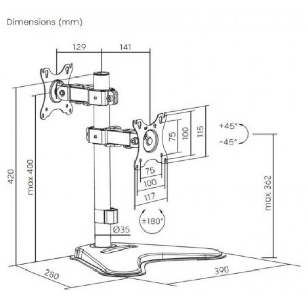 - Tipo: Soporte de mesa inclinable y rotable para 2 monitores/POS (1 pivote, 2 brazos) de 17”-32”