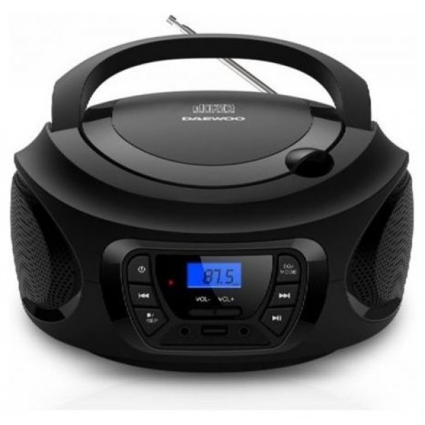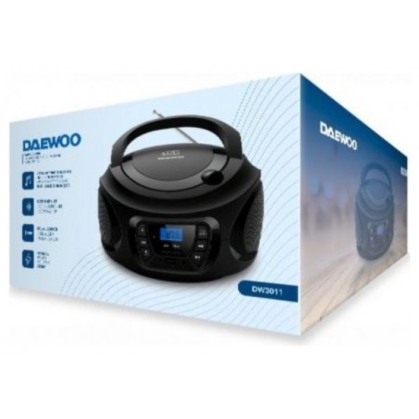 Daewoo DW3011 es una radio CD/FM tipo boombox con Bluetooth, USB, AUX y salida de auriculares, que integra 2×2 W en altavoces estéreo, ecualizador de 5 modos y pantalla LCD. Funciona a corriente AC o con 4 pilas C (LR14) para uso portátil.