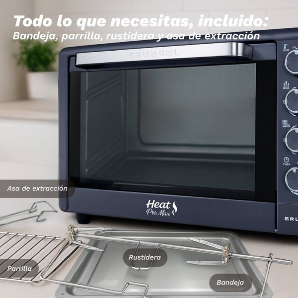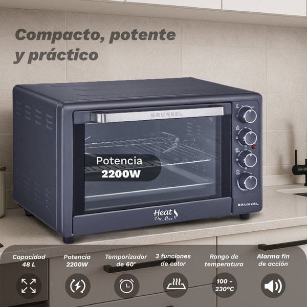 El horno eléctrico de GRUNKEL HR-48PROMAX posee gran capacidad y alto rendimiento, diseñado para quienes necesitan potencia y espacio sin renunciar al control. Con 2000W de potencia y una capacidad de 48 litros, permite cocinar piezas grandes, asar con rustidera o preparar varias recetas a la vez. Su resistencia en M y la función de convección independiente distribuyen el calor de forma uniforme. Ofrece 3 posiciones de calentamiento y un rango térmico de 100 a 230 °C, adaptándose a todo tipo de platos. El temporizador de 60 minutos con señal acústica te avisa al finalizar, y la luz interior automática te permite ver el proceso sin abrir la puerta. Su diseño incluye doble cristal de seguridad, acabado en acero inoxidable y accesorios completos: bandeja lisa, rejilla, rustidera y asa extractora. El horno HR-48PROMAX es la solución perfecta para cocinar con volumen, seguridad y precisión.