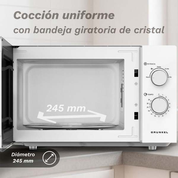 El GRUNKEL MW-25EASY es un microondas mecánico de uso sencillo, ideal para quienes buscan funcionalidad y espacio. Gracias a su capacidad de 25 litros, permite calentar o cocinar platos de mayor tamaño con comodidad. Su potente motor de 850W y los 5 niveles de potencia lo hacen versátil para adaptarse a todo tipo de alimentos. Incluye función de descongelado, ideal para tratar alimentos congelados de forma rápida y segura. El temporizador mecánico de hasta 35 minutos ofrece un control preciso del tiempo de cocción. La bandeja de cristal garantiza una distribución uniforme del calor y la cocción homogénea de los alimentos. Además, cuenta con apertura mediante tirador, mandos accesibles y diseño clásico que se integra fácilmente en cualquier cocina. El GRUNKEL MW-25EASY es la solución perfecta para quienes desean un microondas práctico, potente y con mayor capacidad.Especificaciones