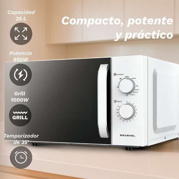 Microondas Grunkel MW-25EASY/ 850W/ Capacidad 25L/ BlancoGRUNKEL – Microondas MW-25EASY de 25L con 850W Microondas de GRUNKEL MW-25EASY, 25 L, 850W, 5 niveles, descongelar, temporizador 35 min, ban..