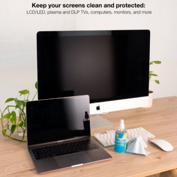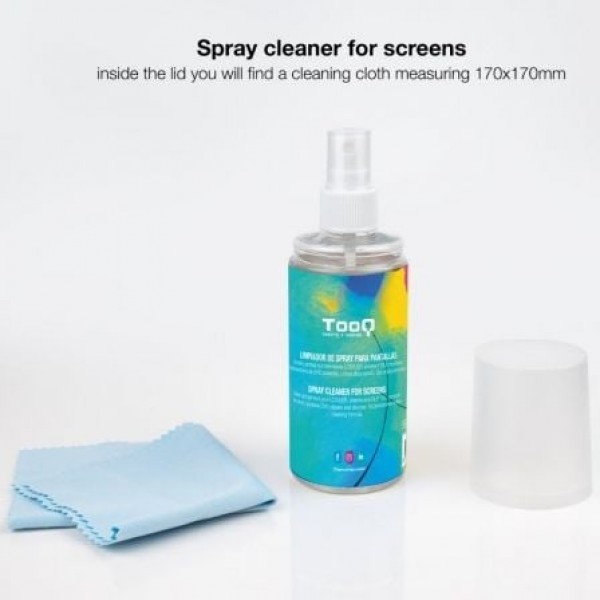 ¡Ahora tus pantallas brillarán con luz propia!. Nuestro kit limpiador en spray es perfecto para quitar cualquier ancha y mota de polvo que tenga tu dispositivo. No contiene alcohol ni amoníaco e incluye un paño de microfibra.. . Especificaciones:. . Válido para limpiar pantallas de TV, de portátiles, de monitores, teléfonos, etc.. Limpiador de 150 ml. Incluye paño de microfibra de 170x170 mm. No contiene alcohol, ni amoníacos. Peso neto: 0,183 kg. Peso bruto: 0,200 kg
