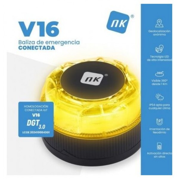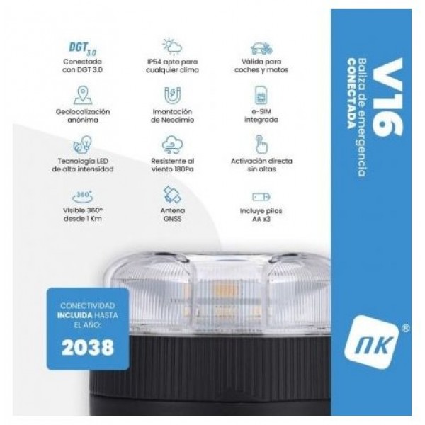 NK Baliza V16 conectada a DGT 3.0. Visible 360°, datos incluidos hasta 2038, uso sin apps ni cables, resistente al agua