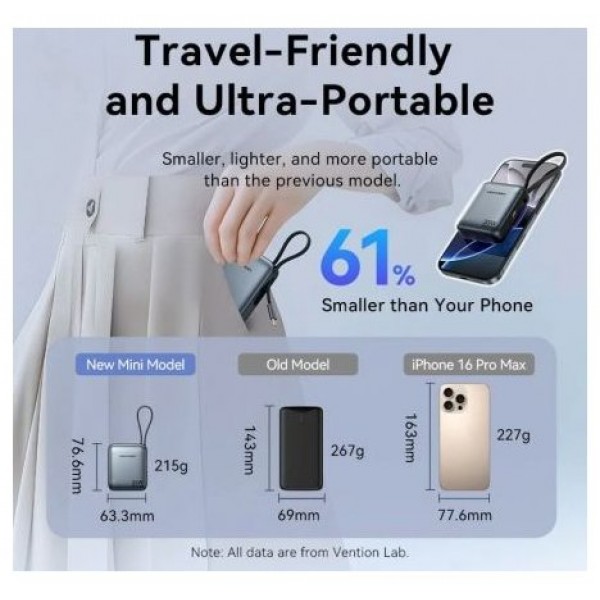 Powerbank 20000mAh Vention FKDM0/ 65W/ Gris/ Incluye Cable USB Tipo-C20000mAh Power Bank (USB-C + USB-C/USB-A) with Built-in USB-C Cable 65W Gray LED Display TypePower Bank 20000mAh con Carga Rápida 6..