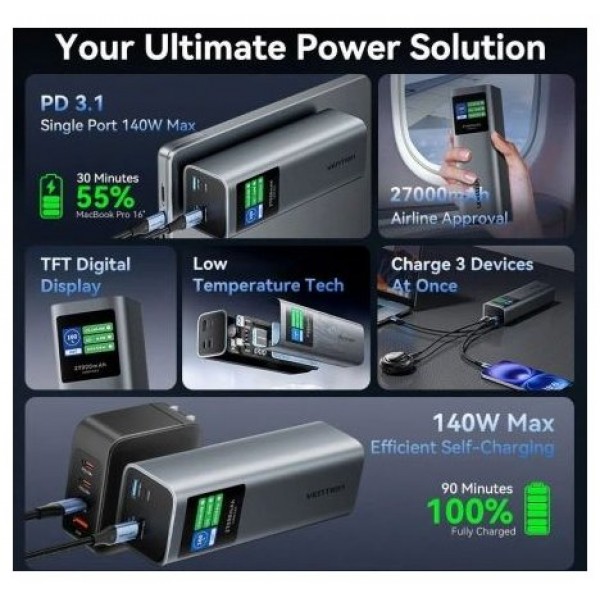 Este cargador portátil permite una carga rápida bidireccional de hasta 140W, ideal para portátiles como el MacBook Pro 16". Carga un MacBook Pro al 55 % en solo 30 minutos mediante el puerto de 140W. También ofrece una carga rápida y eficiente para el propio power bank.
