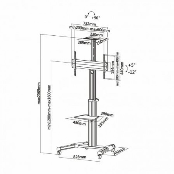 - Angulo de Inclinación: -12º / +5º. Ángulo máximo de rotación: 0º / +90º (de panorámico a vertical). Altura máxima del soporte: 2069 mm. Rango de ajuste para la altura del soporte TV:1200-1600mm