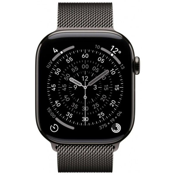 - Tamaño y peso: 42 mm (alto) x 36 mm (ancho) x 9,7 mm (grosor), 374 x 446 píxeles, superficie de pantalla de 989 mm², peso aluminio GPS 30,3 g, aluminio GPS + Cellular 29,7 g, titanio 34,6 g, para muñecas de 130 a 200 mm