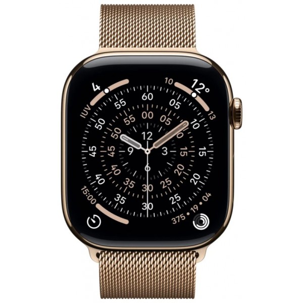 - Tamaño y peso: Alto: 46 mm, Ancho: 39 mm, Grosor: 9,7 mm, 416 x 496 píxeles, Superficie de pantalla de 1.220 mm², Peso (aluminio, GPS): 37,8 g, Peso (aluminio, GPS + Cellular): 36,9 g, Peso (titanio): 43,1 g, Para muñecas de 140 a 245 mm