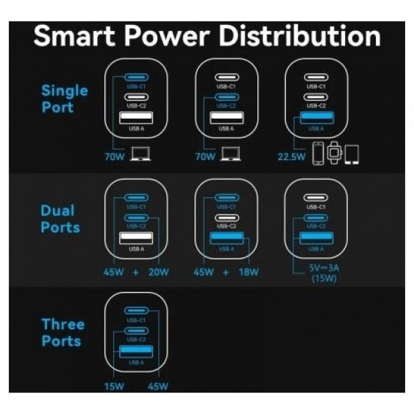 - Salida USB-C1/USB-C2: 5,0V⎓3,0A 15,0W; 9,0V⎓3,0A 27,0W; 12,0V⎓3,0A 36,0W; 15,0V⎓3,0A 45,0W; 20,0V⎓3,5A 70,0W