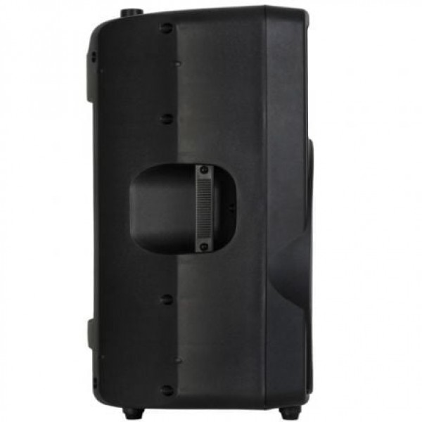 Altavoz autoamplificado con caja de inyección PP extra resistente. Reproductor USB/SD/MP3 con mando a distancia. Salida para pantalla pasiva. Woofer protegido con rejilla metálica frontal. Asas de transporte, puntos de suspensión, patas para suelo y forma de monitor. Orificio en la base para tubo de 35 mm.