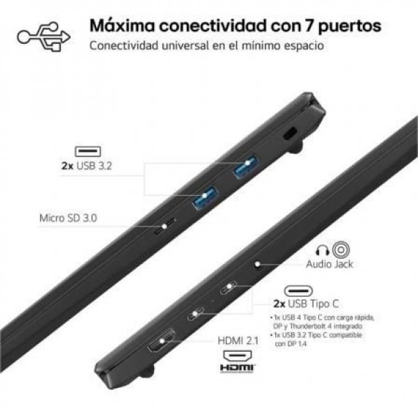Ultraligero, con tan solo 1,2Kg de peso, batería de hasta 24,5 horas de autonomía* y ahora más fino con 13mmNueva pantalla OLED 3K (WQXGA+) (2880x1800) de 40,6 cm (16") en formato 16:10, con tratamiento antirreflejos, tasa de refresco de hasta 120Hz y amplio rango de color DCI-P3 100%Nuevo chasis mejorado aún más fino de magnesio y nanocarbono de gran resistencia superando 7 pruebas del estándar militar STD-MIL-810H.Procesador Intel® Core™ Ultra 7, con memoria RAM ultrarrápida LPDDR5x de 32GB integrada en placa y disco duro SSD de 1T NVMe de 4ª Generación con doble ranura ampliable.