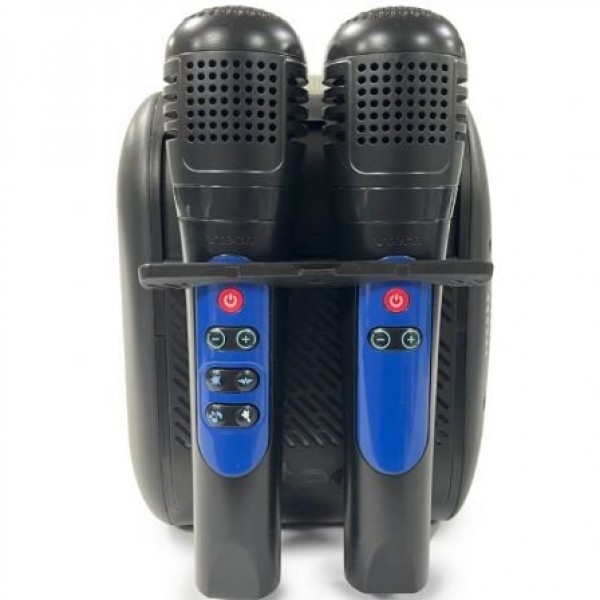 - Dos micrófonos para cantar a dúo, con 4 botones con efecto vibrato, efecto que simula coros y efectos para modificar la voz.
